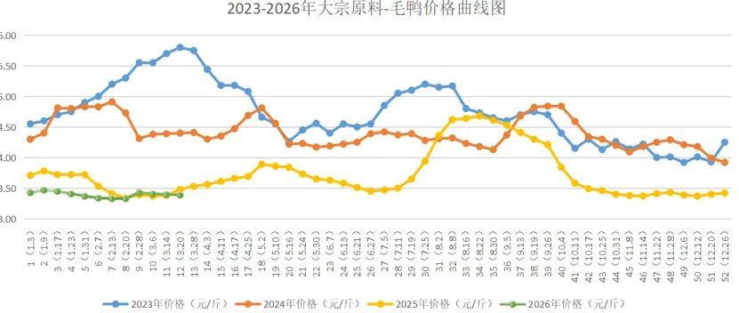 毛鸭本周均价3.39元/斤,较上周3.40元/斤下跌0.01元/斤,环比下跌0.29%;较2025年同期(3.48元/斤)下跌2.59%;较2024年同期(4.40元/斤)下跌22.95%;较2023年同期(5.80元/斤)下跌41.55%。 本周市场毛鸭价格先跌后稳运行,市场需求不足,毛鸭价格下跌为主。2、板冻鸭胸