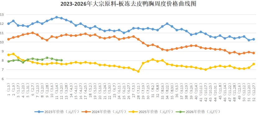 板冻鸭胸本周均价8.03元/斤,较上周8.05元/斤下跌0.02元/斤,环比下跌0.25%;较2025年同期(7.60元/斤)上涨5.66%;较2024年同期(10.70元/斤)下跌24.95%;较2023年同期(12.60元/斤)下跌36.27%。