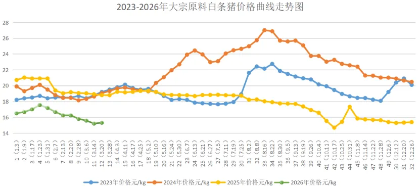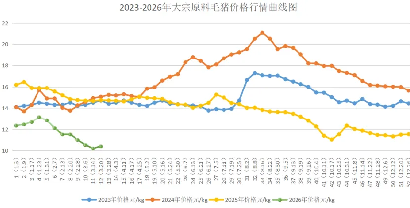 本周国内生猪交易均价10.43元/公斤,较上周10.22元/公斤上涨0.21元/公斤,环比上涨2.05%,较2025年同期(14.74元/公斤)同比下跌29.24%,较2024年同期(15.05元/公斤)同比下跌30.70%,较2023年同期(14.70元/公斤)同比下跌29.05%。本周生猪行情受供应收紧与需求复苏双重支撑,价格震荡上行,底部支撑持续强化呈现。市场上呈现“北稳南强”格局,南北方刚需回暖。3月出栏计划有序落地,未出现集中放量。饲料成本微涨,猪粮比回升至4.87:1。自繁自养生猪头均亏损收窄至290元,养殖端亏损压力进一步缓解。本周二次育肥群体进场积极性有所提升,采购需求集中于90-110kg中小体重猪只,预计下旬二次育肥群体入场积极性将进一步提高,进场节奏或将加快。预计下周生猪价格以上涨趋势为主,北方稳中有涨,南方涨幅可能扩大。2、猪肉