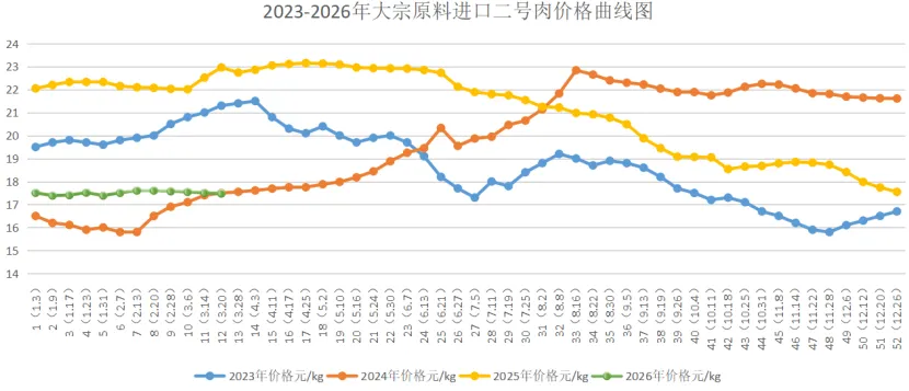 巴西进口2号肉本周均价17.49元/kg,较上周17.51元/kg下跌0.02元/kg,环比下跌0.11%;较2025年同期(22.96元/kg)下跌23.82%;较2024年同期(17.50元/kg)上涨0.06%;较2023年同期(21.30元/kg)下跌17.89%。