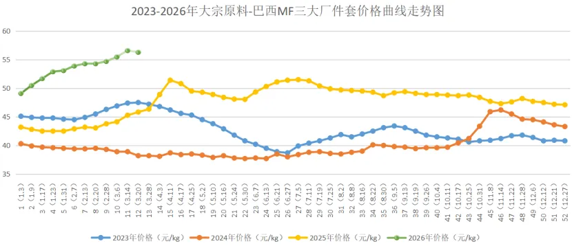 巴西MF三大厂件套本周均价为56.30元/kg,较上周价格56.60元/kg下跌0.30元/kg,环比下跌为0.53%;较2025年同期(45.83元/kg)上涨22.85%;较2024年同期(38.20元/kg)上涨47.38%;较2023年同期(47.50元/kg)上涨18.53%。