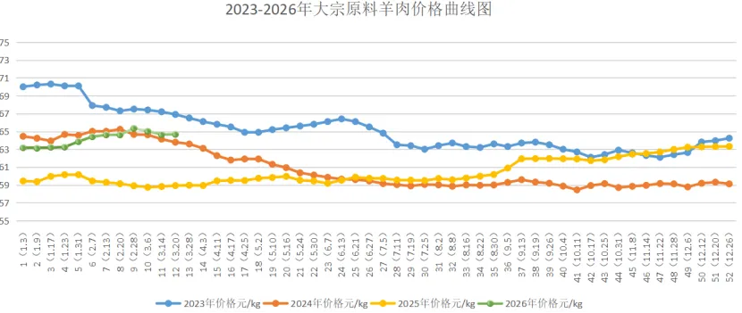 国产羊肉本周均价为64.68元/kg,较上周价格64.65元/kg上涨0.03元/kg,环比上涨为0.05%;较2025年同期(58.93元/kg)上涨9.76%;较2024年同期(63.79元/kg)下跌1.40%;较2023年同期(66.90元/kg)下跌3.32%。本周国产羊肉价格基本稳定,随着天气温度逐渐升高餐饮、烧烤等终端需求增强,整体消费动力的提升,导致羊肉走货较上周有所加快;但活羊集中出栏,市场供应相对充足,部分区域出现供大于求的情况,对羊肉价格的上涨起到限制作用;综合判断预计下周羊肉价格将保持稳中有调整的态势。影响行情因素:从全国活羊的价格看(元/斤):华中地区:绵羊11.0-12.3,山羊13.3-14.3,黑山羊15.0-15.3。华东地区:绵羊12.8-14.3,山羊14.2-15.2。华南地区:山羊12.1-15.9,黑山羊13.8-18.4;华北地区:绵羊11.8-12.7,山羊12.8-14.3。东北地区:绵羊12.3-12.9,山羊13.7-14.8。西北地区:绵羊11.3-12.6,山羊13.3-14.3。