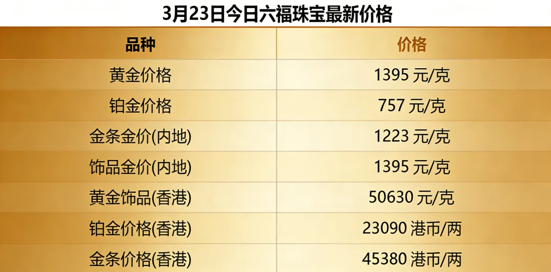 今天六福珠宝更新了金价,内地黄金饰品卖到1395元一克,金条是1223元一克,铂金要757元一克,这个差价看起来挺明显,买金条比买首饰每克能省下172元,这差距可不是个小数目。