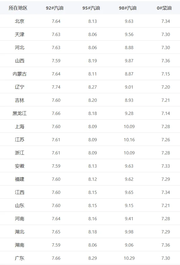 今日汽油油价通知: