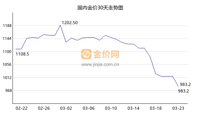 今日国内金价下跌,现价973.56 元/克,下跌-6.40%,今日开盘价1038.38,最高价1044.00,最低价935.00。