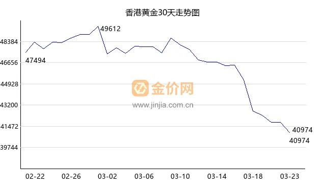 今日香港黄金下跌,现价40596 港币/两,今日开盘价41838,最高价41944,最低价40190。