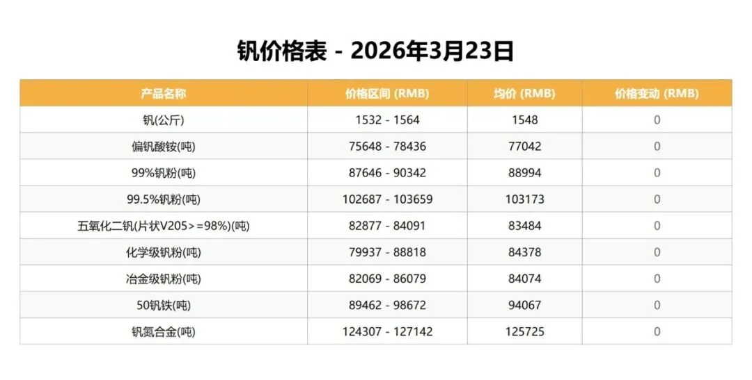 今日钛产品市场整体平稳,所有品类价格均未发生变动。钒产品市场同样全线持稳,各品类价格均保持不变。