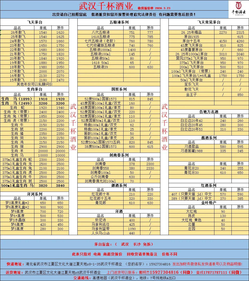 1、本行情价格为各品类酒的市场回收价格,查查收货线报以北京、上海、广州、深圳、贵阳、成都、武汉等7城市的主要酒行当天的报价来计算全国综合平均数据。实际成交价格每个城市会有差异。