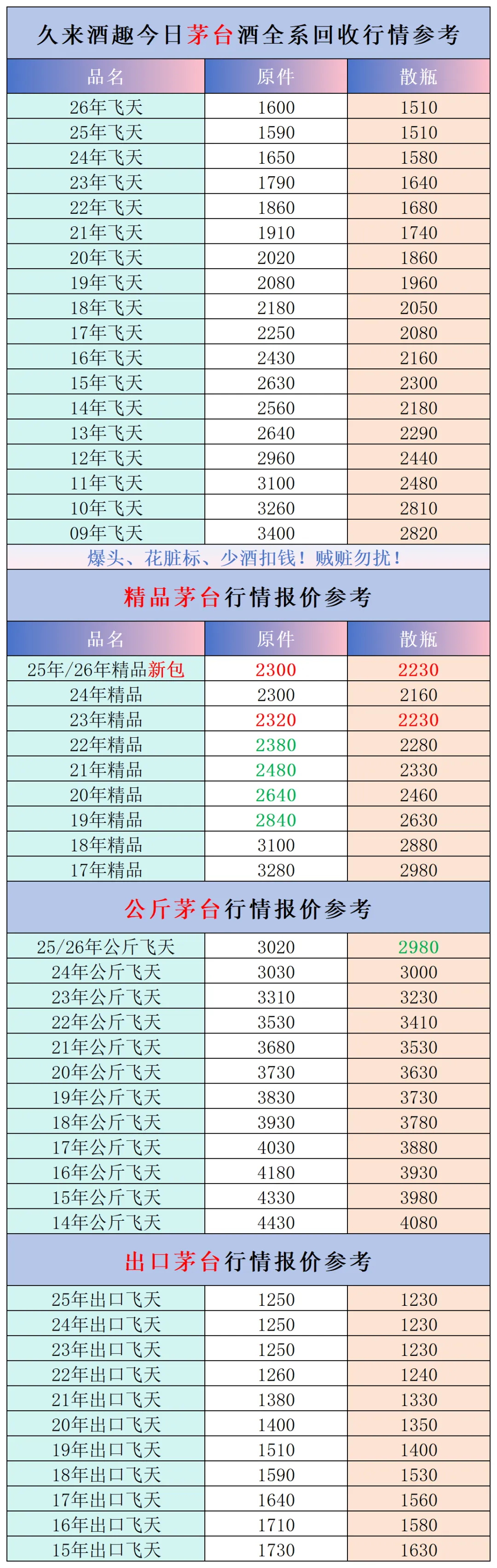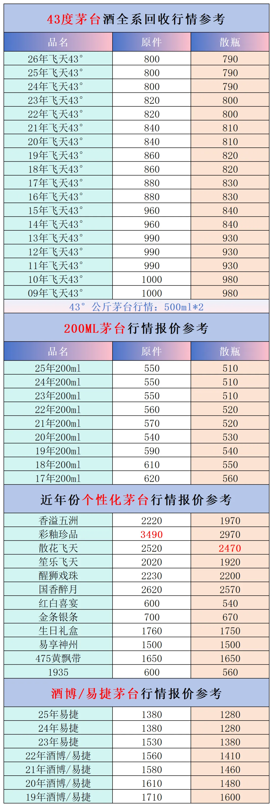 本公众号提供各种名酒回收行情报价,常规茅台、五粮液、洋河、剑南春、国缘等。所有报价根据市场买卖行情总结而来,每天更新最新报价!部分酒水每天涨跌幅较大,无法及时更新请谅解。本报价仅供参考,并非实际成交价格。感谢您的关注!我们会竭尽所能,提供更多更好的服务。