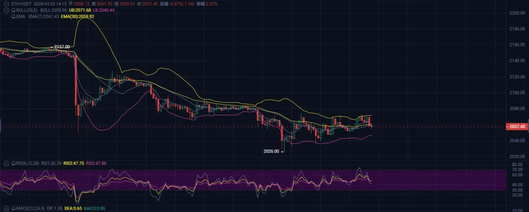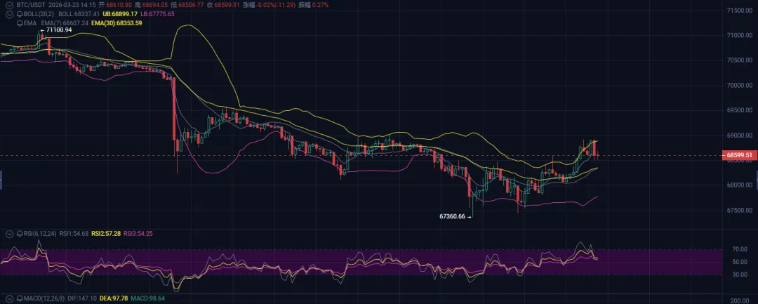 如果1-2小时级别能站稳它上方,说明小级别反弹要开始了,上方压力位依次看69530、71000、72540附近。反过来,如果今天连68450都站不上去,说明反弹力度弱,那下方支撑就留意67320、65590、64000这几个位置。