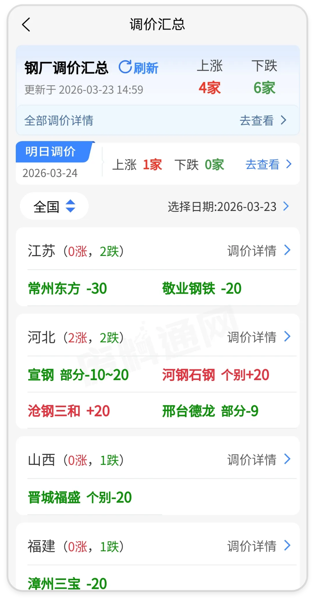 3月23日起江苏【东方特钢】废钢价格下调30元,含税价为2560元。具体废钢价格以DFTG20260004为准。边角精料:2610,钢筋切粒:2610,船板料1:2590,船板料2:2550,冲压精料1:2610,冲压精料2:2580,炉料一:2560,炉料二:2540,炉料三:2520,重废一:2480,重废二:2410,重废三:2340,车运含税。3月23日0时起,江苏【敬业基地计划】废钢含税价格统一下调20元/吨。具体价格如下:钢板料(6mm):2343元/吨,重废一(10mm):2322元/吨,重废二(8mm):2292元/吨,重废三(6mm):2282元/吨,次重废(4mm):2186元/吨,特级破碎料1类:2235元/吨。3月23日12:30河北【张宣科技废钢】采购挂牌价调整通知破碎料1.0、破碎料1.5、精品破碎料2.0、钢屑压块95价格下调20元/吨。熔融类废铁价格不做调整。其他料型价格下调10元/吨。最新价:重型2326-2346,中型2286,小型2179,轻料1938,不含税