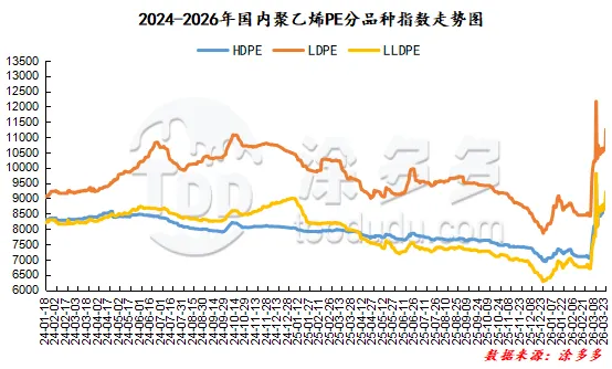 今日国内PE市场价格整体呈现强势运行的走势。华北地区线性、高压、低压膜料、低压拉丝牌号的市场价格均有不同程度的上涨,价格上调区间在250-800元/吨,华东地区线性、高压、低压膜料、低压拉丝牌号的市场价格均上涨,整体价格调整区间在400-700元/吨,华南地区线性、高压、低压膜料、低压拉丝牌号的市场价格均较上周五上涨,价格波动区间在500-800元/吨。国内PE生产企业定价呈现结构性分化,出厂报价整体以持稳为基调,多数牌号价格上调100-1000元/吨,仅个别牌号小幅下调100元/吨,受排产与库存影响,部分企业暂未公布最新报价,市场同时存在部分牌号货源紧缺的情况。受出厂端调价,以及期货盘面走高带动,现货市场报价重心同步上移,贸易商普遍采取随行就市的灵活操作策略,实际成交均以一单一议的方式展开。下游行业对高位价格接受度有限,整体采购心态偏谨慎,多以观望为主,仅维持少量刚需采购,市场实盘成交量依旧偏少,整体交投氛围未有明显改善。