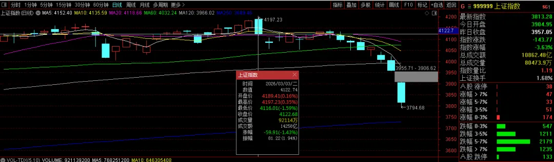20260323 沪深A股 港股行情 跳空低开 大跌 沪市盘中跌破3800点