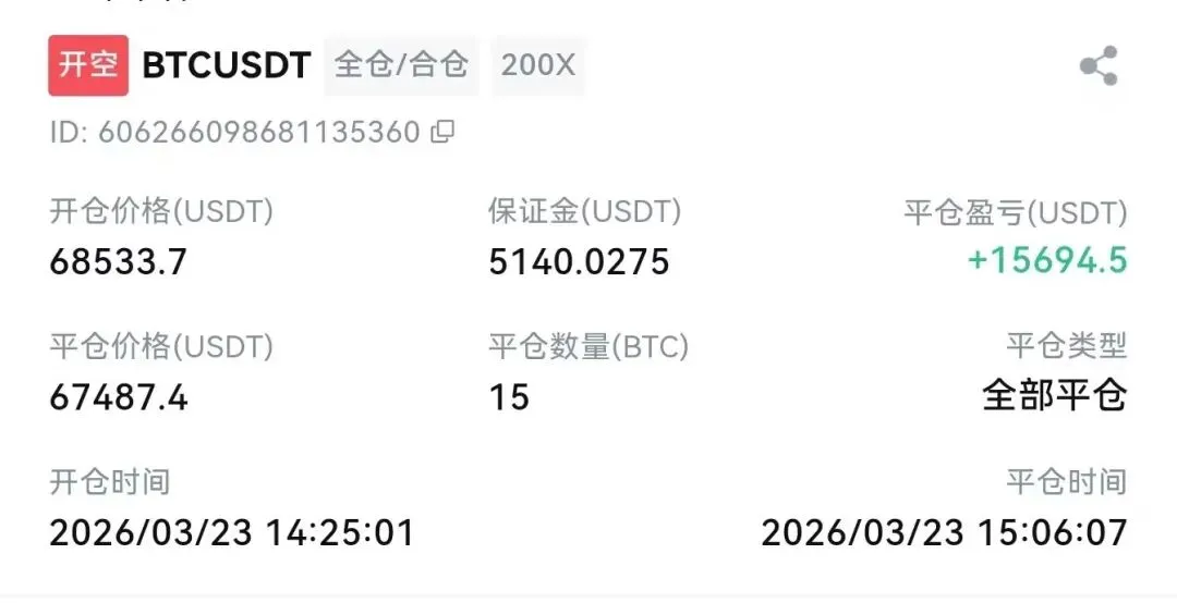 从比特币4小时图来看,币价结构呈现空头主导,反弹承压。从3月18日的高点约73000-74000开始,比特币4小时级别进入明确的下跌趋势:高点逐步降低、低点持续下探,3月23日最低触及67360一线,属于典型的空头主导结构。即使3月23日尾盘出现小幅反弹,也仅为下跌过程中的弱势反弹,未改变整体空头格局。4小时级别空头趋势明确,当前反弹仅为下跌过程中的技术性修复,无反转基础,是接空的窗口期。晚间我们思路不变,继续追空。