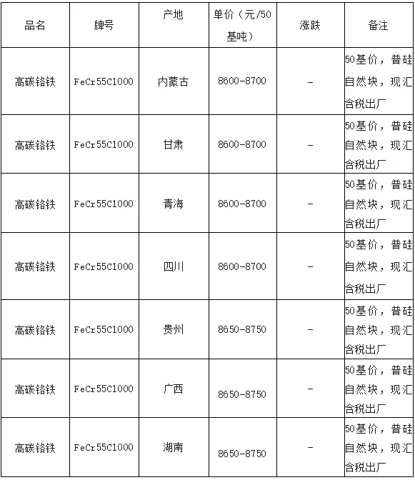品名 | 牌号 | 产地 | 单价(万元/50基吨) | 涨跌 | 备注 |