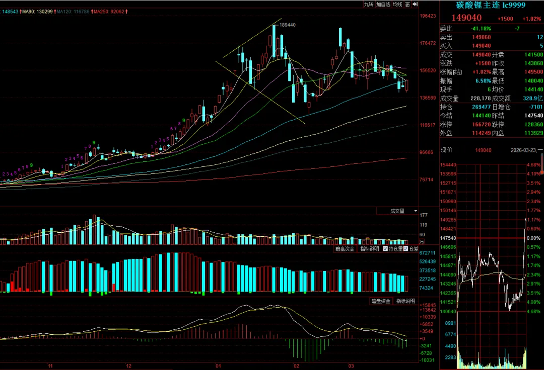 今天碳酸锂呈现低开高走的震荡行情,成交量紧缩,收盘价149040元,上涨1.02%,振幅6.58%。