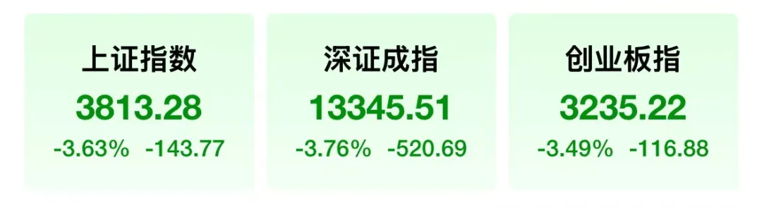 上证指数以3813.28点收盘,跌3.63%。深证成指跌3.76%,创业板指跌3.49%。