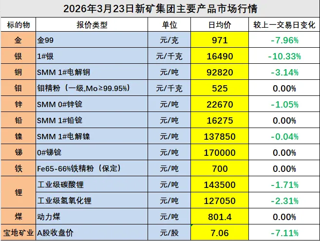 >今日行情 | 2026年3月23日新矿集团主要产品市场行情