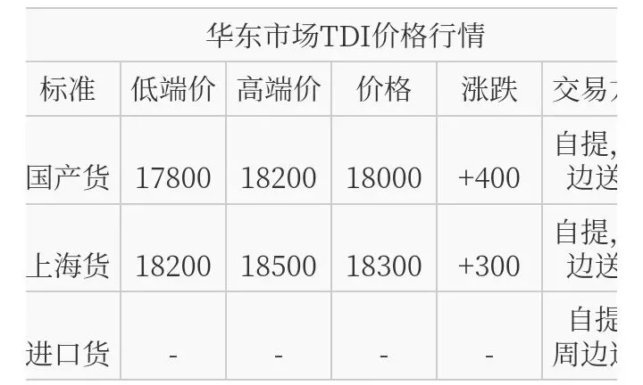 华东TDI国产货报盘价格在17800-18200元/吨;上海货报盘价格在18200-18500元/吨附近。