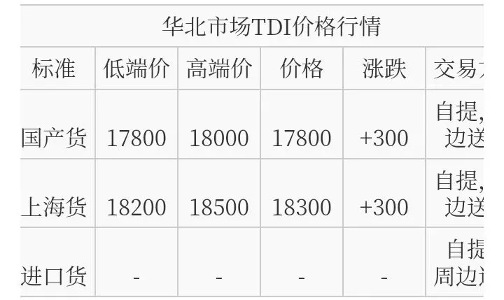 华北TDI国产货报盘价格在17800-18000元/吨,上海货报盘价格在18200-18500元/吨。