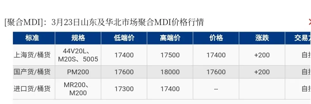 【市场动态】华东区域聚合MDI上海货报盘17400-17600元/吨,国产货源(PM200)报盘17500-17600元/吨,进口货报盘17300-17400元/吨。