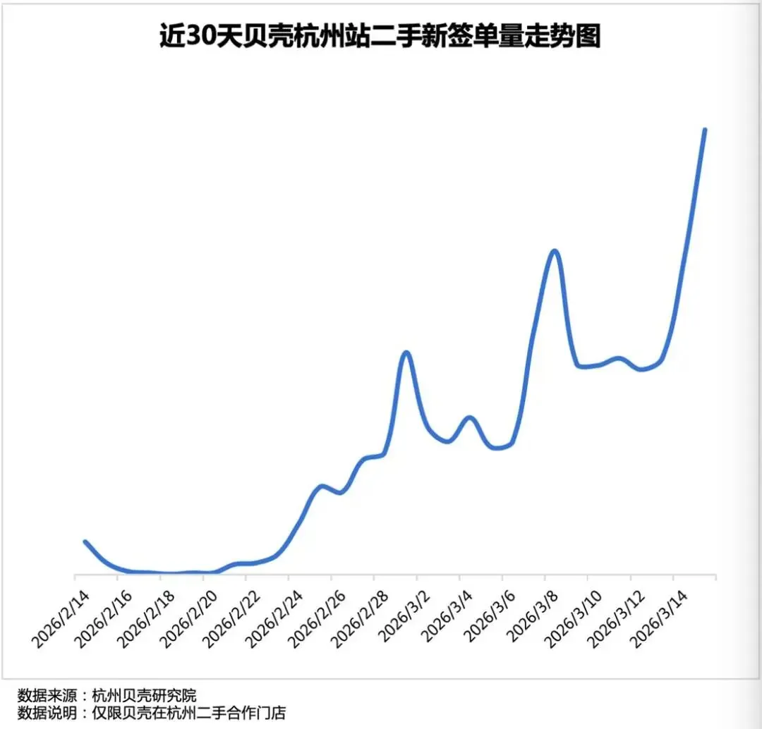 杭州贝壳研究院的数据显示,刚刚过去的这个周末,贝壳门店21号成交量270套、22号周日单天新签超过320套。如果算上其它品牌门店,在过去的两个周末,杭州单天成交量均超过300套,即便工作日的表现有所减弱,按照这样的成交节奏,3月杭州二手房成交量有望站上7000套。