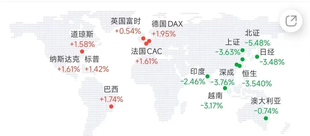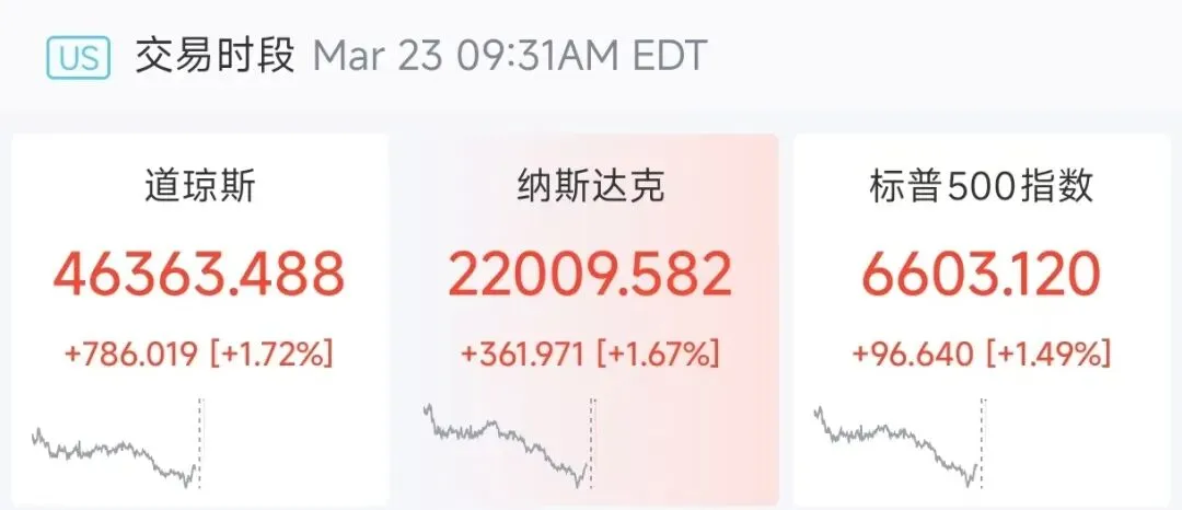 欧美股市短线暴力拉升,美股期货直线拉升。截至19:15,道琼斯指数期货涨2.72%,标普500指数期货涨2.37%,纳斯达克100指数期货涨2.19%。欧洲股市快速拉升,欧洲斯托克50指数涨3.51%,法国CAC40指数涨2.62%,德国DAX30指数涨4.26%,富时意大利MIB指数涨2.22%。此外,富时中国A50指数期货直线拉升,涨超1%。