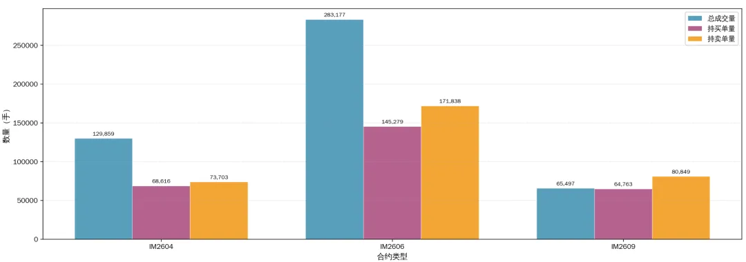 继续分析下成交量及多空持仓排名数据。IM2606 合约以 283,177 手成交量成为绝对主力,占总成交量的 59.2%。IM2606(主力)> IM2604(近月)> IM2609(远月),符合期货市场正常的合约周期规律。各合约均呈现持卖单量大于持买单量的格局,整体市场偏谨慎。