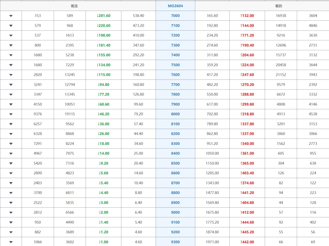 其中MO2604近月合约:看涨期权全线大跌,成交集中在7600-8000,以多头平仓为主;看跌期权普遍大涨,7400-7600成交最活跃,资金大量买入对冲。成交量PCR大于1,短期偏空;持仓PCR小于1,中期仍偏多。