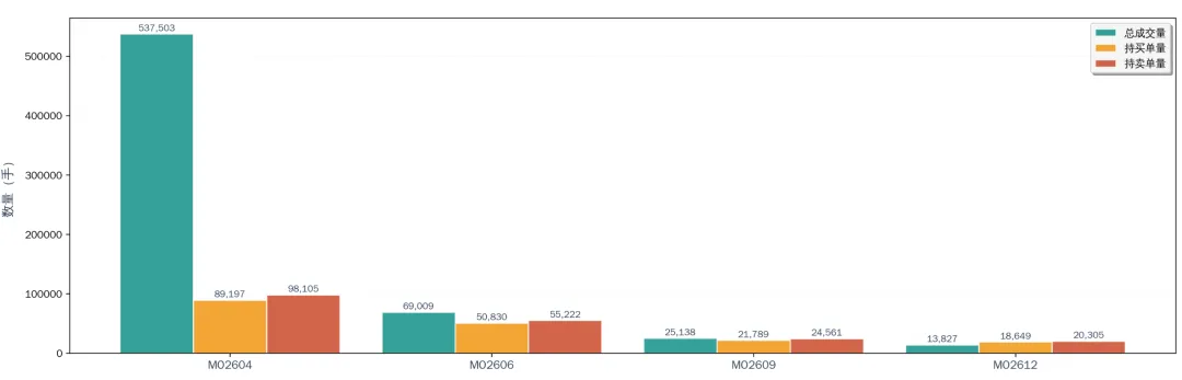 zz1000指数期权MO的成交量及持仓排名数据。MO2604(4 月合约)以 53.75 万手成交量成为绝对主力,占总成交量的83.3%,远超其他合约。成交量随合约到期时间延长递减(MO2604 > MO2606 > MO2609 > MO2612),符合期货市场 “近月活跃、远月清淡” 的正常规律。所有合约均呈现 “持卖单量> 持买单量” 的特征,反映市场整体偏谨慎的情绪。
