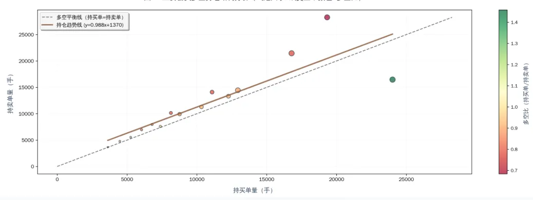多空持仓结构的趋势线显示数据点分布在 “多空平衡线” 下方,验证了市场整体偏空的持仓结构。趋势线斜率接近 1,表明多空持仓整体相对均衡,无极端单边行情,市场波动率相对可控。
