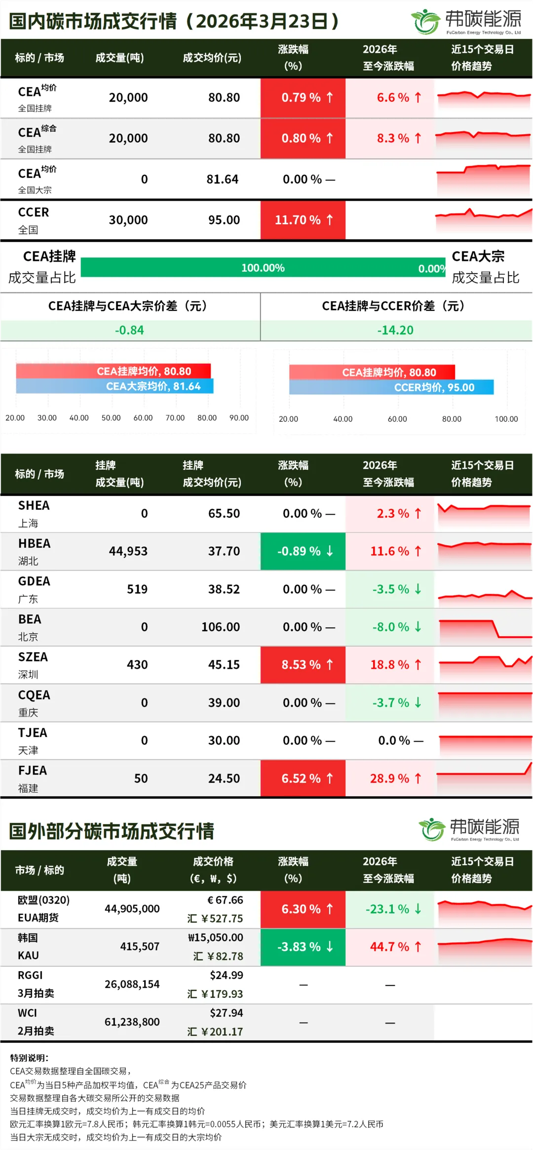 >碳市行情26.3.23 | CEA挂牌成交2万吨,成交均价上涨...