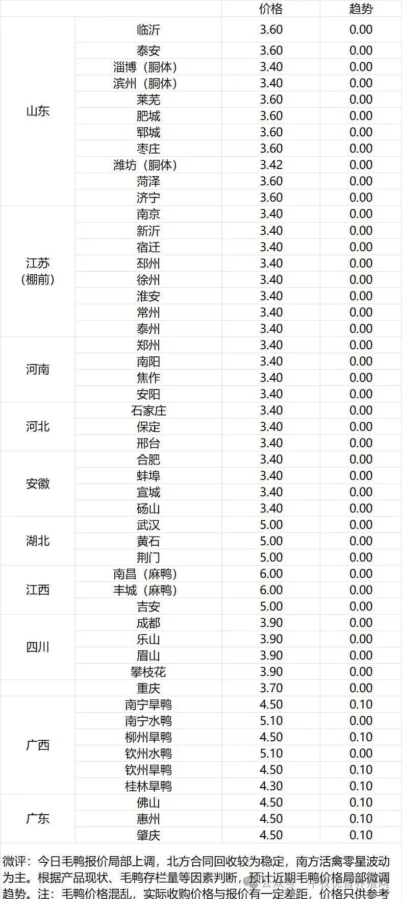 微评:鸭苗报价局部下跌。(注:南方只报当天价格)苗量少,计划紧张,养殖端成本高企,合同发放量控制。根据产品、养殖成本及鸭苗现状分析,预计近期鸭苗价格呈震荡走低趋势。种蛋报价稳定。温馨提示:该价格为主流厂家报价,实际销售价格以成交价格为准,价格仅供参考。