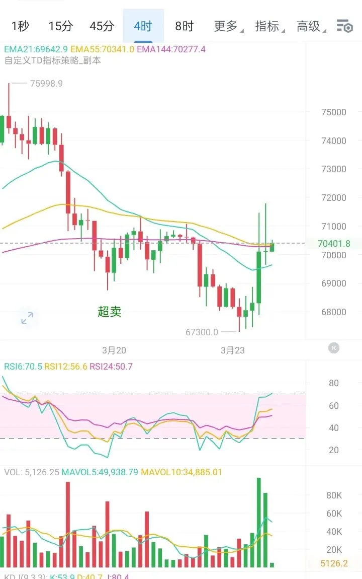 昨晚受川普关于“暂时对伊朗进攻”言论刺激,市场情绪被点燃,比价单边拉升3000余点,最高触及71456一线。随后空头反扑,价格下探至69600后再次企稳于70000上方。随着美股三线高开,比价再度上破高位,最高来到71789附近。目前比价回调至70300一线,多空博弈加剧。