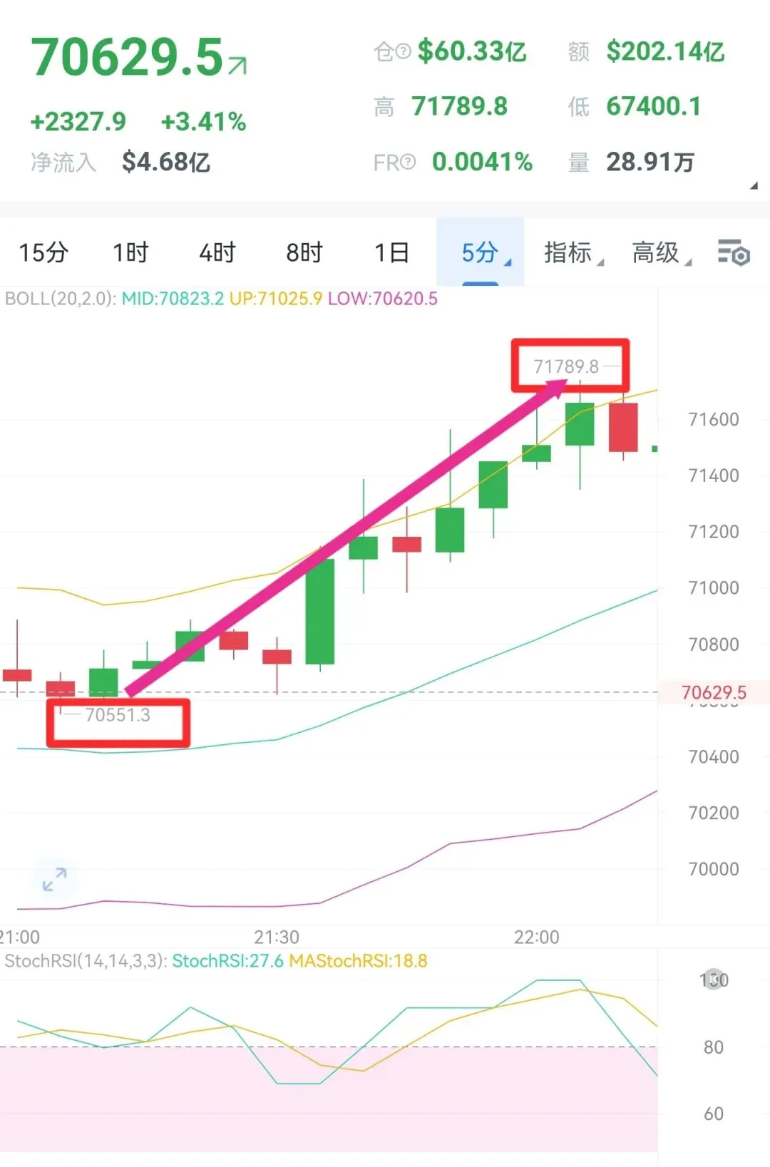 从大饼日线图来看,日线虽有收针,但并未跌破中轨,稳稳的企稳中轨上方,开始走震荡修整,双底筑基稳固,以回踩代替回落,时间伴随空间上的修正,这是多头强势中形态走法,待比价回踩修正结束,后市依旧有向上冲高的动能,以太亦是如此,走出相同形态;4小时图比价企稳boll中轨上方,承压上轨下方,震荡迂回反复,目前大饼第一压力位71500附近,以太2190附近,大饼支撑69500附近,以太2110附近;目前趋势依旧以多头占为主导,带好支撑上的防守,突破看延续,跌破临磐结合形态再行反手,操作一切以实磐为准。