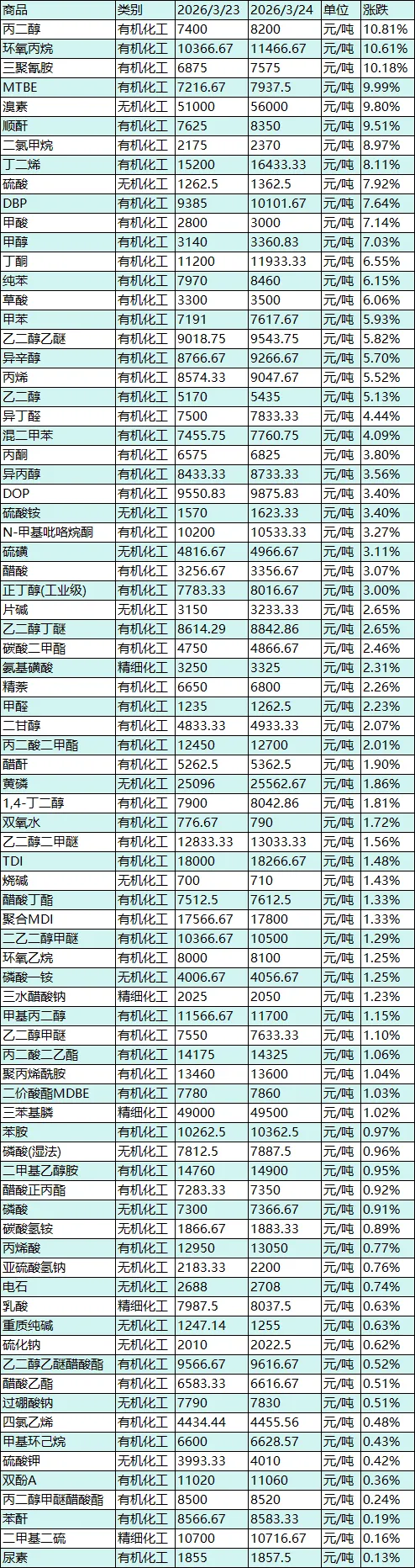 -丙二醇(+10.81%,7400元/吨升至8200元/吨):下游刚需爆发+成本支撑+供应偏紧,三重驱动下强势领涨,成为今日市场最大亮点。需求端,节后涂料、化妆品、医药、食品添加剂等下游行业全面复工,刚需补库需求集中释放,采购量大幅增加,供需传导顺畅;成本端,上游丙烯价格上涨5.52%,成本传导直接且顺畅,同时国际原油高位运行提供间接成本支撑,企业成本压力上升,挺价意愿强烈;供应端,国内部分丙二醇生产装置处于检修状态,产能释放受限,市场现货供应偏紧,持货商报盘高位,多重因素共振下,丙二醇价格单日上涨10.81%,短期涨势有望延续。