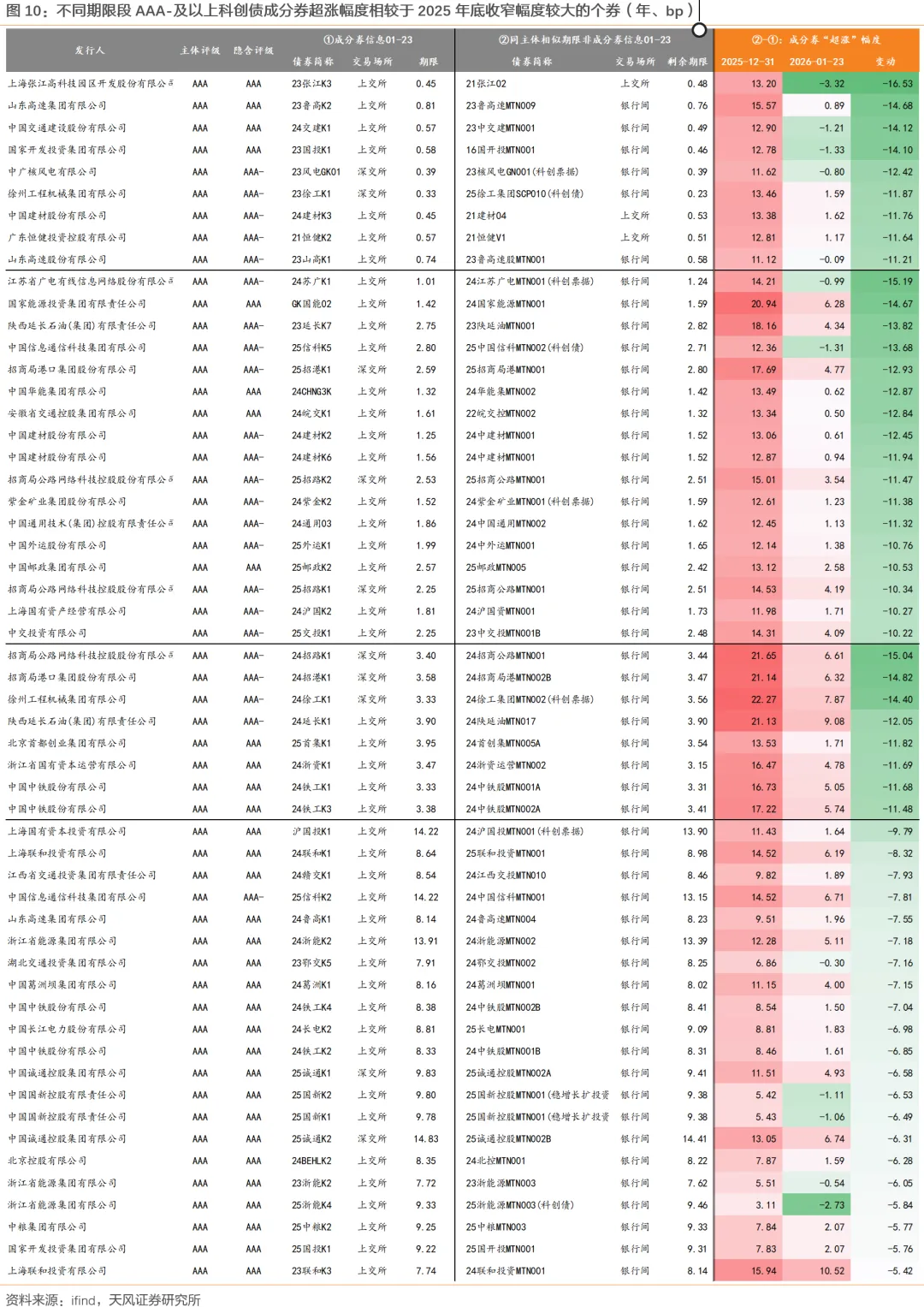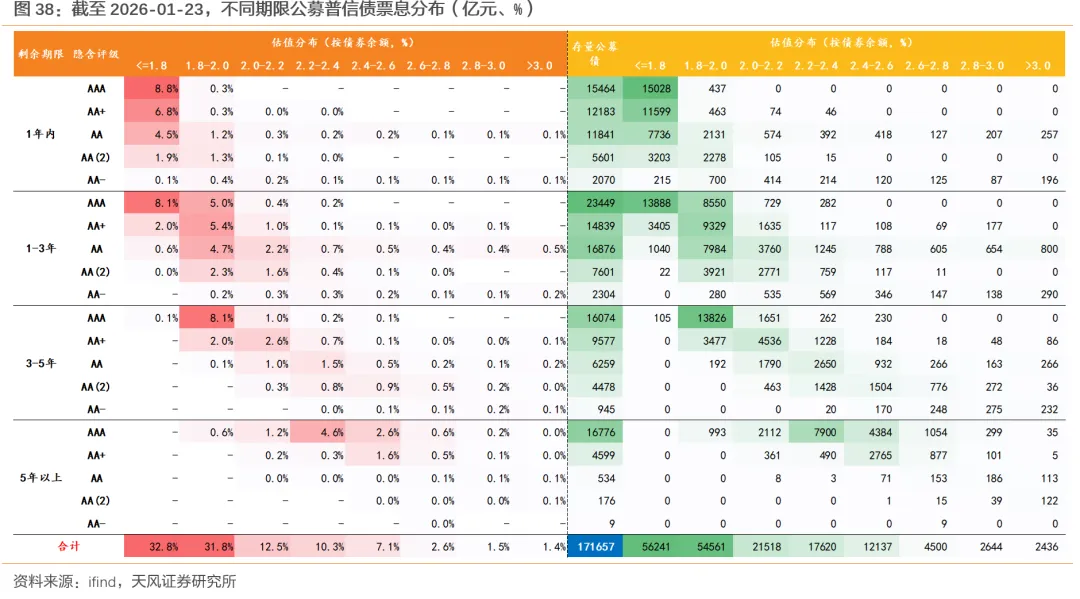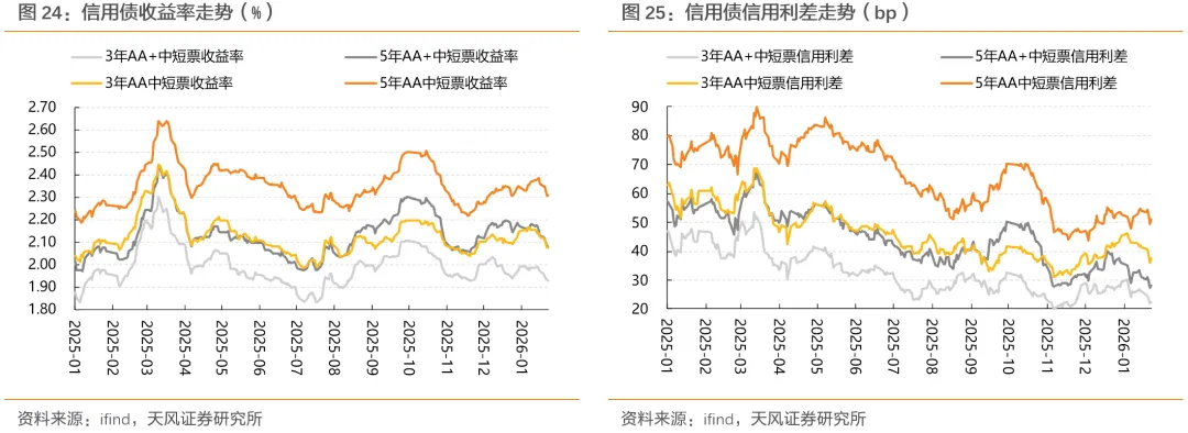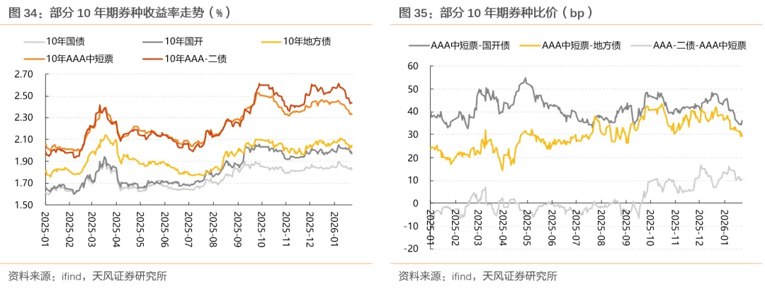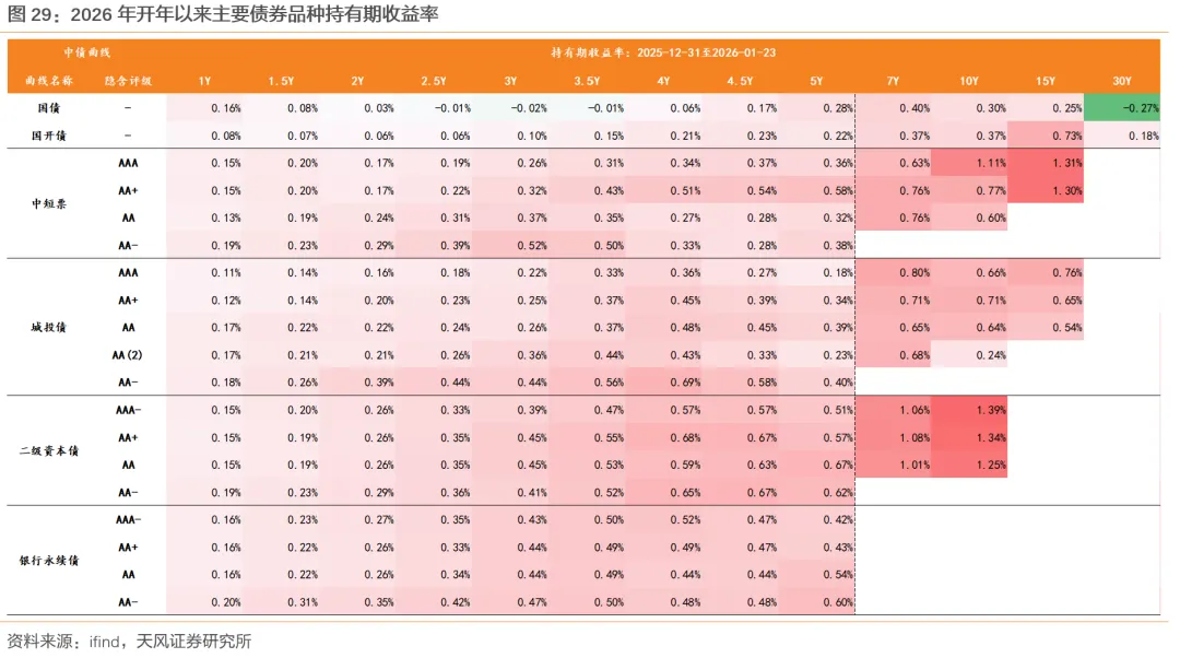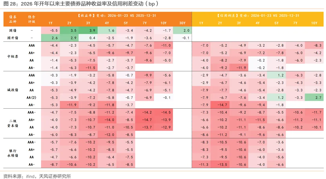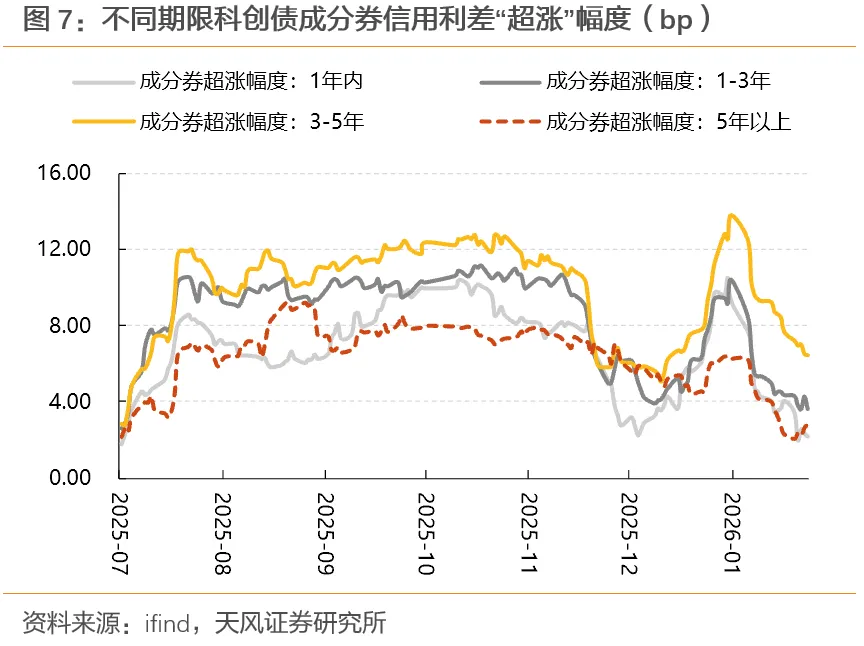 截至1月23日,成分券相较于非成分券的“超涨”幅度约4bp,较2025年底的超涨幅度收窄6+bp,3-5年期限段的成分券超涨空间的收窄幅度显著高于其他期限段。