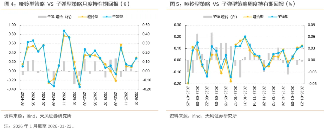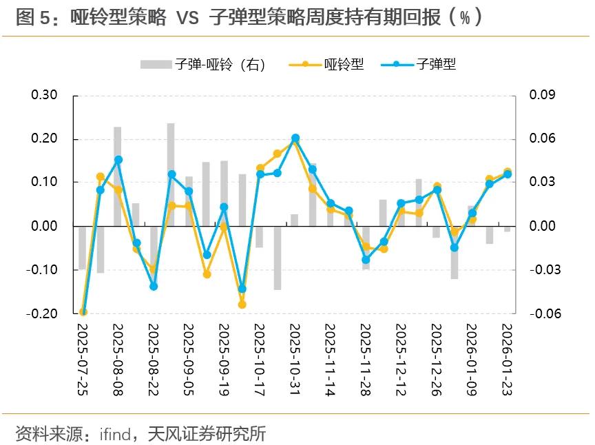本周,短端相对“克制”,中长端领涨,超长端表现不弱的情况下,哑铃型和子弹型策略组合持有期收益均为0.12%。
