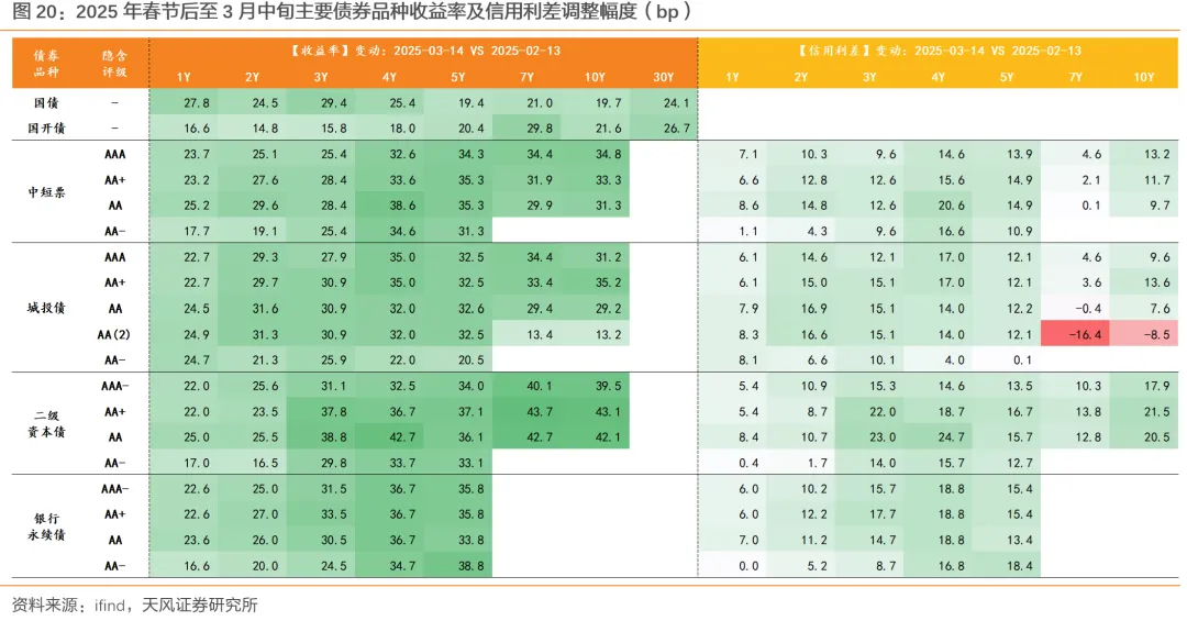 (3)5年期以上超长信用债收益率调整幅度多在40+bp,对应信用利差走阔幅度在10-30bp,二永调整幅度高于城投、高于产业。
