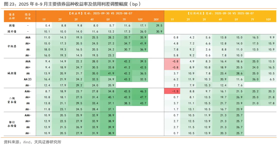 8月以来,随着股债“跷跷板”效应深化,债市进一步调整,信用利差中枢抬升且呈现短信用相对抗跌、中长信用承压的特征;