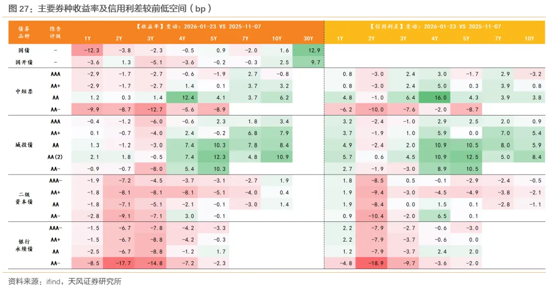 一方面,当前信用利差较2025年11月7日的阶段性低点空间不算大,部分4-5年期及以上城投下沉券种较低点空间或较大,但随着化债关键时间点临近,城投债期限利差持续性压缩可能性或较低,尤其是长久期的弱城投。