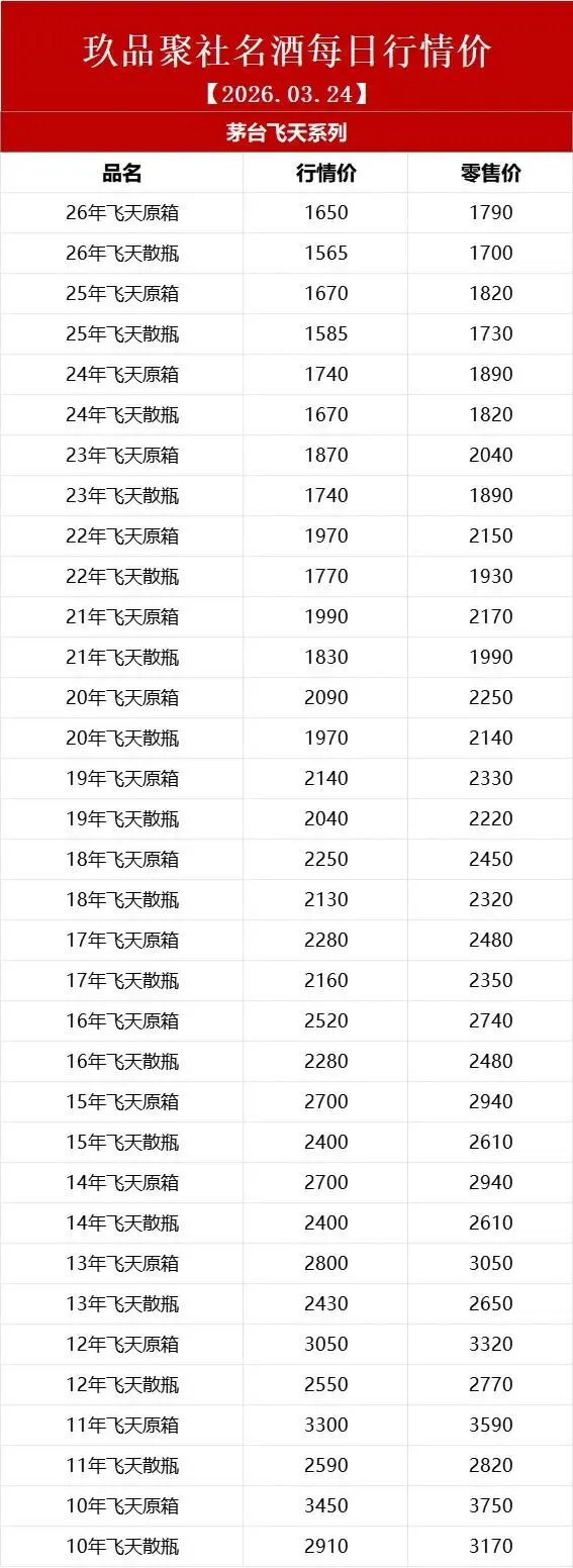 玖品聚社名酒行情:2026年03月24日名酒出货行情价
