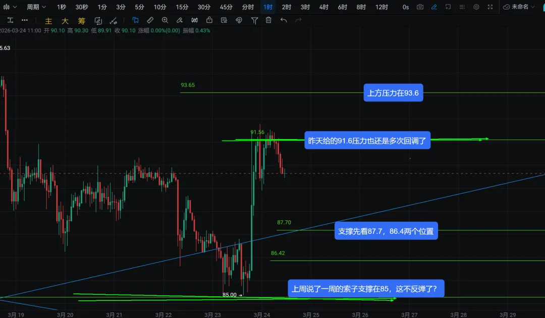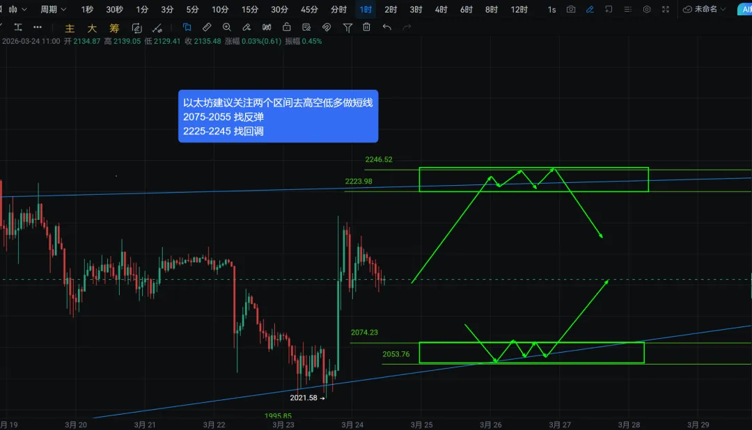 黑马—HM社区于2020年创立,致力于打造专业、价值的多维赋能技术教学社区,助你少走弯路,顺遂前行昨天的行情是黄毛一顿嘴炮又现暴力拉升了,昨日的思路也是尽量找反弹做多的,可惜没到我们埋伏的6.6w附近,太可惜了。昨日的日线在趋势线上收了底部模型,逻辑是需要继续找反弹的,如果直接两级反转也就是昨日的阳线再次被阴线吞没了,那这个行情就非常搞了。但是我们去做大概率的事情,就是在关键点找反弹,仍然是当前性价比最高的操作。$BTC 大饼昨晚说了注意小级别M头的建立,并给了激进型同学们71100-71300的追空点位,晚上打到也回调了,今天要留意继续回调到68600,67900这些位置有没反弹的可能。上方压力在72600,74200。$SOL 索子上的行情,给的是很精准了,上周重复一周的85支撑直接反弹到昨天中午给的压力91.6了。这里继续反弹的话压力在93.6,下方支撑87.7,86.4先看有没反弹。$ETH 以太坊关注两个区间去做就行了,下方2075,2055两个位置找反弹,上方2225-2245找回调。综上,趋势线上出现了底部模型需要我们去注意找反弹了,这是当前性价比比较高的操作,如果直接两级反转那也不是能预料到的事,尽人事知天命,做好我们能做的,剩下的交给市场!