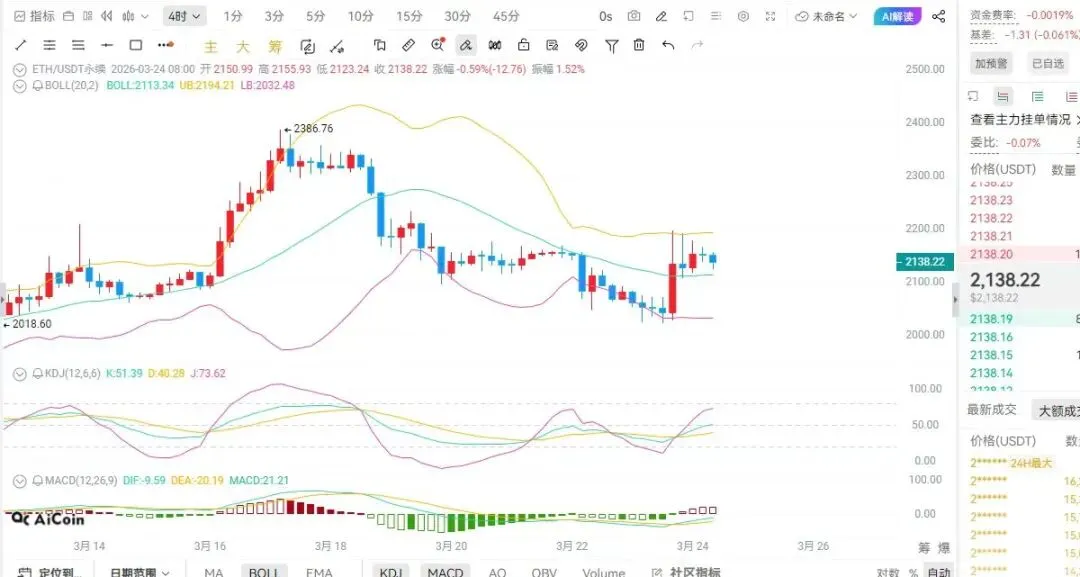 以太坊自从2月份跌到最低1740后,开启缓慢反弹行情,从日线图中可以看出,价格紧贴中轨运行,布林带呈扩张喇叭口型,上下轨之间的空间较大,说明短期处于震荡整理状态,若价格站稳中轨并放量,那么目标可以看至2200至2250
