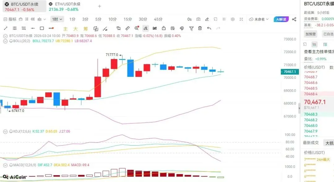 比特币目前的价格在70400左右,处于高位震荡整理阶段,日线图中价格已经运行至布林带中轨上,说明价格已经站稳中轨上方,是短期的一个强烈看多信号,MACD红色量能柱有所缩短,但是DIF线依然在DEA线之上,说明日线级别的中期多头趋势并未改变