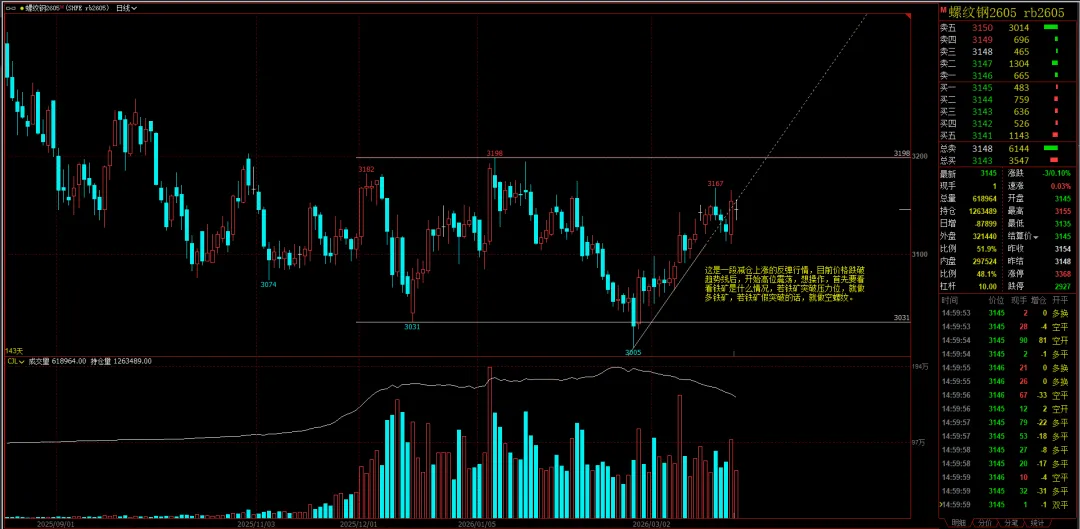 2、螺纹2605:年后的螺纹同样开启了一波缩量减仓震荡上涨的行情,缩量减仓的迹象比铁矿明显,目前螺纹同样是在压力位下方开启横盘震荡,像是在等某种信号指令。在黑色中我只关注了铁矿和螺纹,目前铁矿处于是否突破压力位的关键阶段,一旦放量增仓突破,那么两个品种中首选做多铁矿。若是铁矿出现了假突破的话,做空就要选螺纹,螺纹相比铁矿较弱,不过从螺纹震荡反弹的左侧走势上看,想做螺纹的空头怕也是困难重重,注定磕磕碰碰。