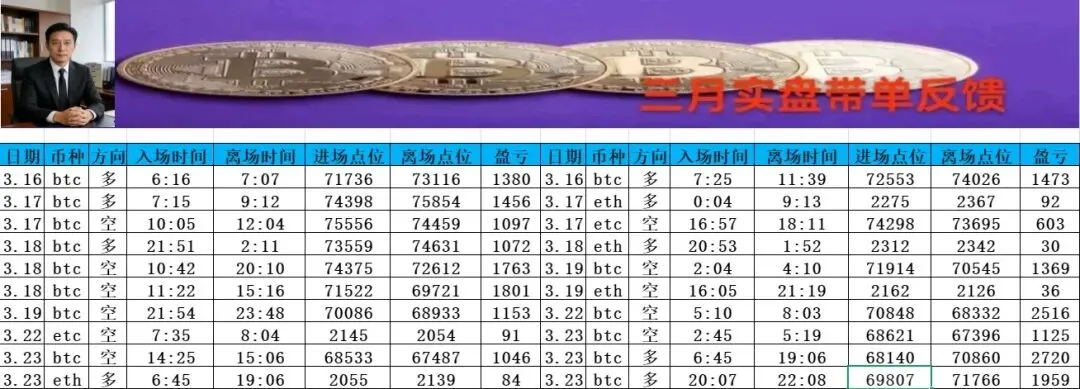 从昨天第一波反弹之后,上分压力逐步释放,局部回踩之后给到我们入场接多的机会,昨天布局的大饼多单在69807附近上车接多,待币价涨至71766时我们落袋离场,多单斩获1959点空间。市场环境复杂多变,没有人能预知未来,我们能做的就只有跟随市场行情的变化调整自己的思路策略。