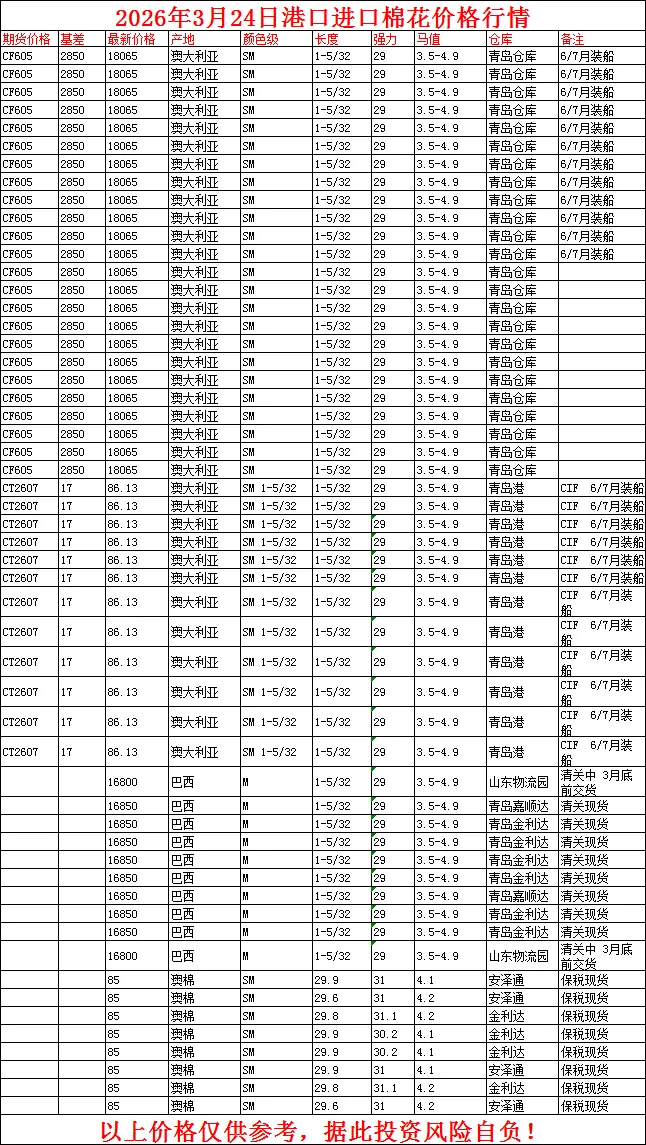 据顺风棉花网sfmianhua.com棉花大数据中心最新监测显示,3月24日港口最新进口棉花价格行情。长期追踪棉花市场价格变动,欢迎关注我们。 顺风棉花网始创于2005年8月,是国内最早从事棉花信息咨询服务的专业平台之一。二十年来,我们始终致力于为产业链企业提供涵盖籽棉、皮棉、进口棉及棉花期货的全方位信息咨询服务,已成为业内信赖的专业信息机构。依托深厚的行业数据积淀与持续的研究,我们为棉纺企业提供精准、及时的《美棉每日报告》与《郑棉每日报告》,助力企业进行基差点价、期货套保、场外期权及生产经营决策,有效应对市场波动。【核心会员服务内容】每日棉花现货与期货价格基差数据最新皮棉行情与港口进口棉行情速递专业日报:美棉市场日报、郑棉市场日报深度行情动态与市场预测分析