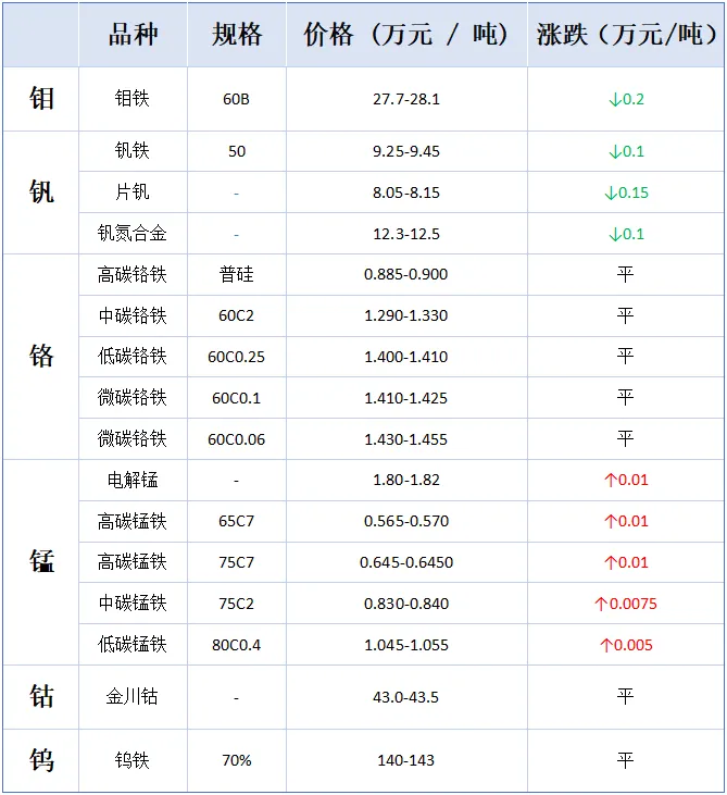 今日导读:钼价阴跌,钒价承压回落,钴价维稳持平,锰价小幅上涨,铬价持稳坚挺,钨价继续持平。