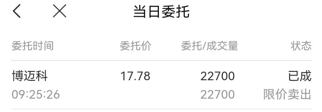 直接在9点25分集合竞价之后挂跌停价17.78卖出,争取在第一时间卖出,锁定利润,避免大幅震荡带来的被动操作。在9点30分连续竞价开始之时成交卖出。
